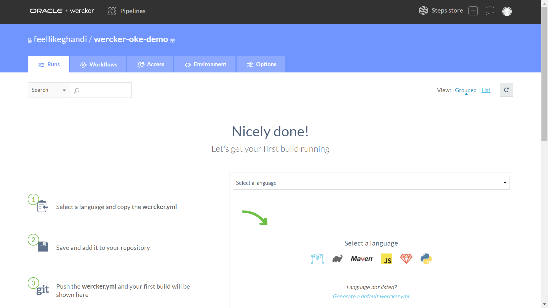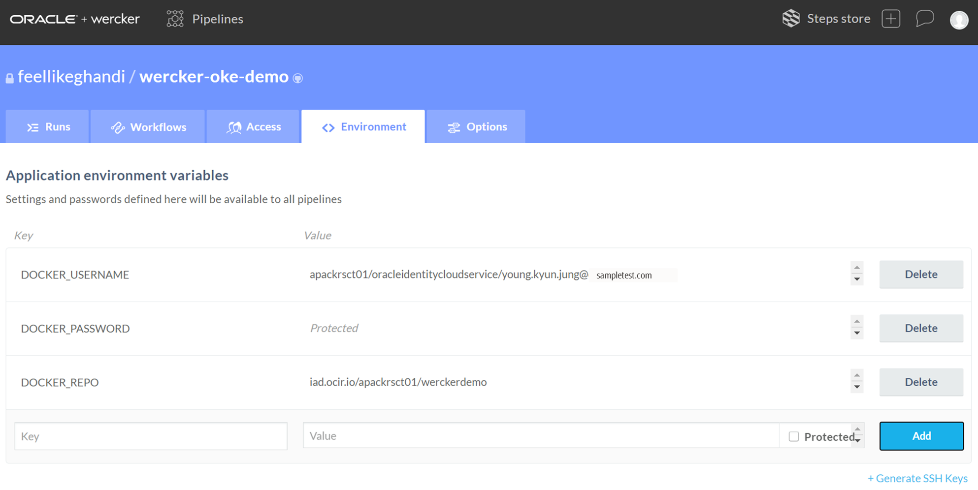 DOCKER_REPO는 <region-code>.ocir.io/<tenancy name>/<registry name>을 입력한다. registry name은 OCI 레지스트리에 업로드될 레포지토리명이다. 여기서는 “werckerdemo”라고 입력했다.