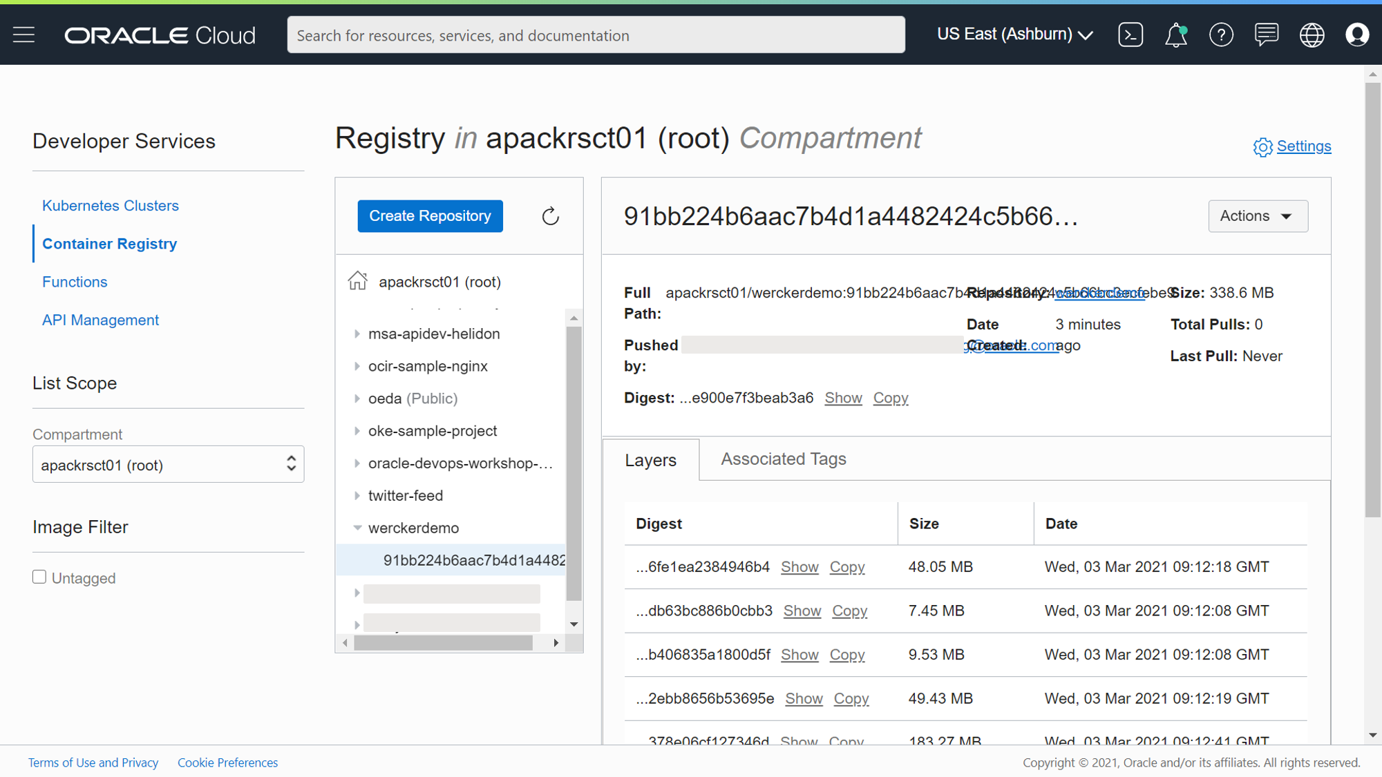 실제 OCI 레지스트리로 이미지가 Push되어 있는지 확인한다. OCI 레지스트리 화면으로 이동해 보면 앞서 지정한 “werckerdemo”라는 이름으로 레포지토리가 생성되어 있음을 알 수 있다.