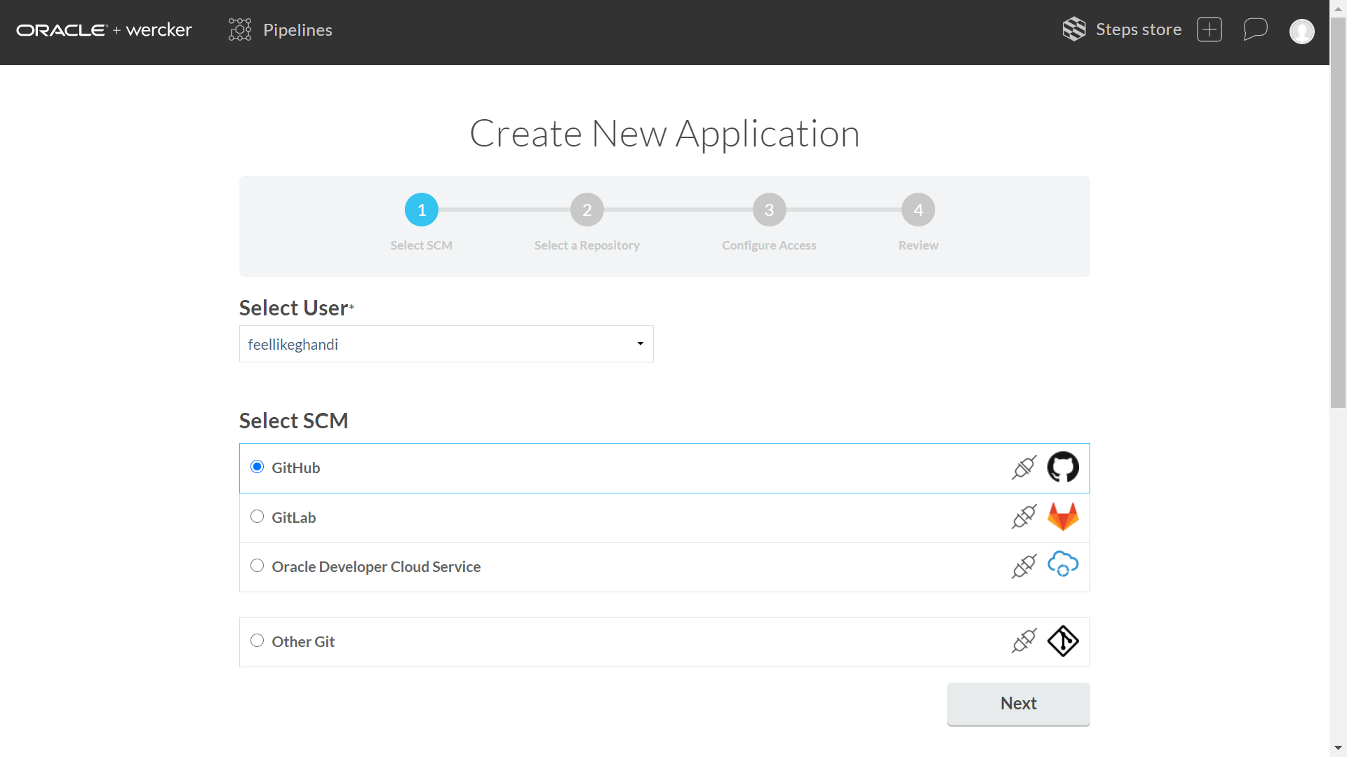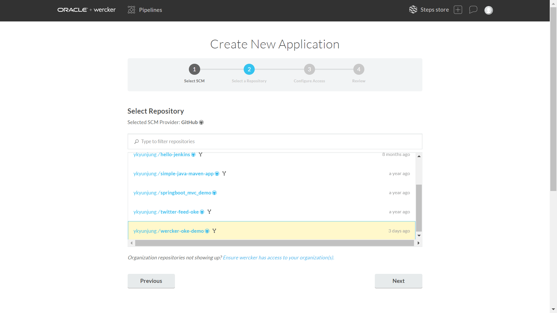 두번째 단계로 앞서 GitHub에서 Fork했던 어플리케이션 소스 “wercker-oke-demo”를 선택 후, 하단의 “Next”를 클릭한다.