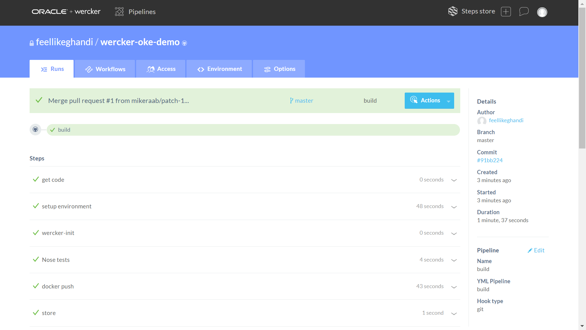 마스터 커밋의 경우 Wercker는 파이프 라인을 실행하고 이미지를 빌드하고 이미지를 OCIR에 푸시 한 다음 컨테이너를 OKE의 인스턴스에 배포하고 실행중인 컨테이너, 파드를 교체하여 어플리케이션을 업데이트한다.