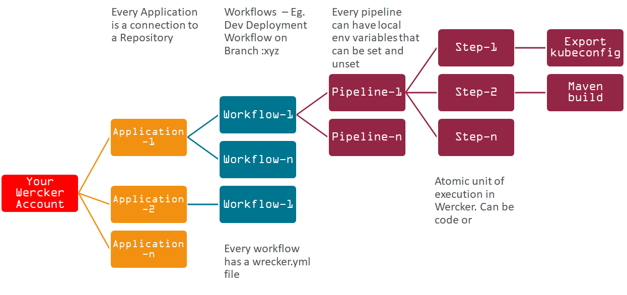 Wercker에 대해 간략히 살펴보면 스텝(Step), 파이프라인(Pipeline), 워크플로우(Workflow)의 구조로 어플리케이션을 빌드하고 배포한다. 리포지토리에서 가져온 소스를 Wercker 어플리케이션으로 만들고, 워크플로우로 실행한다. 워크플로우 안에는 빌드, 배포 등의 파이프라인으로 구성되면, 각 파이프라인에는 스텝으로 상세화되어 있어서 실행 상태를 확인할 수 있다.