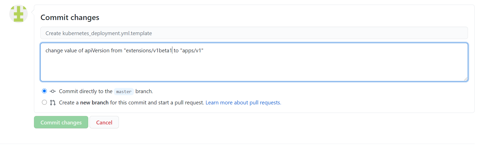 이는 매니페스트 파일에서 디플로이먼트 자원에 대해 선언한 API 버전 “extensions/v1beta1”이 현재 배포한 쿠버네티스 1.8에서는 실행되지 않기 때문에 정식 버전임을 의미하는 “apps/v1”로 변경했다. 하단의 코멘트 부분에 “change value of apiVersion from "extensions/v1beta1 to "apps/v1"라고 입력하고 “commit changes”를 클릭하여 소스 변경을 완료한다.