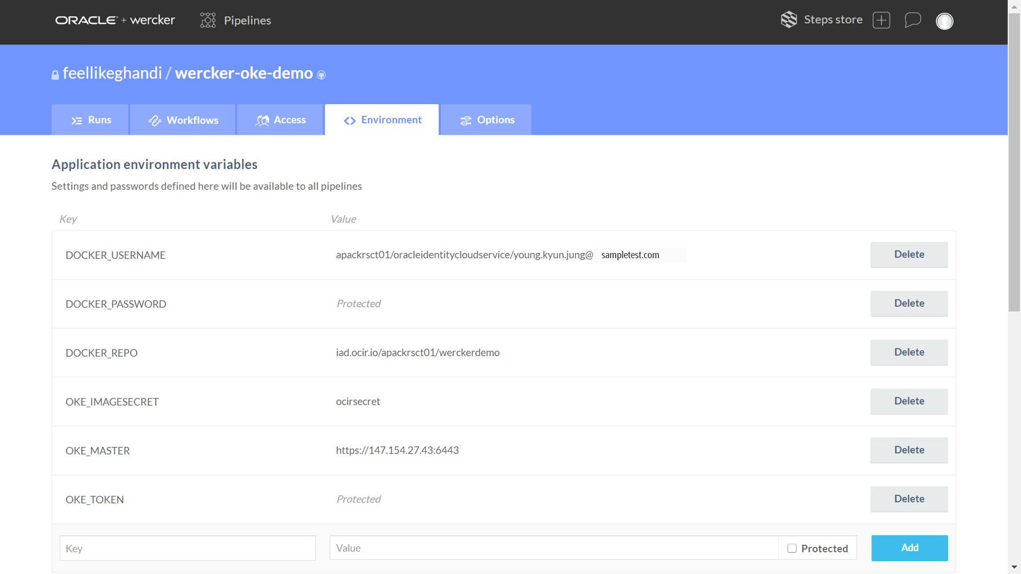 각 변수의 값을 Wercker의 환경 변수로 전달해야 한다. Wercker로 이동하여 앞서 생성한 Wercker 어플리케이션에서 Enviornment 화면에서 아래와 같이 환경 변수를 입력하고 “Add”를 클릭하여 저장한다. OKE_TOKEN 의 경우 Value 입력 후, “Protected”를 클릭하여 값을 마스킹 처리한다.