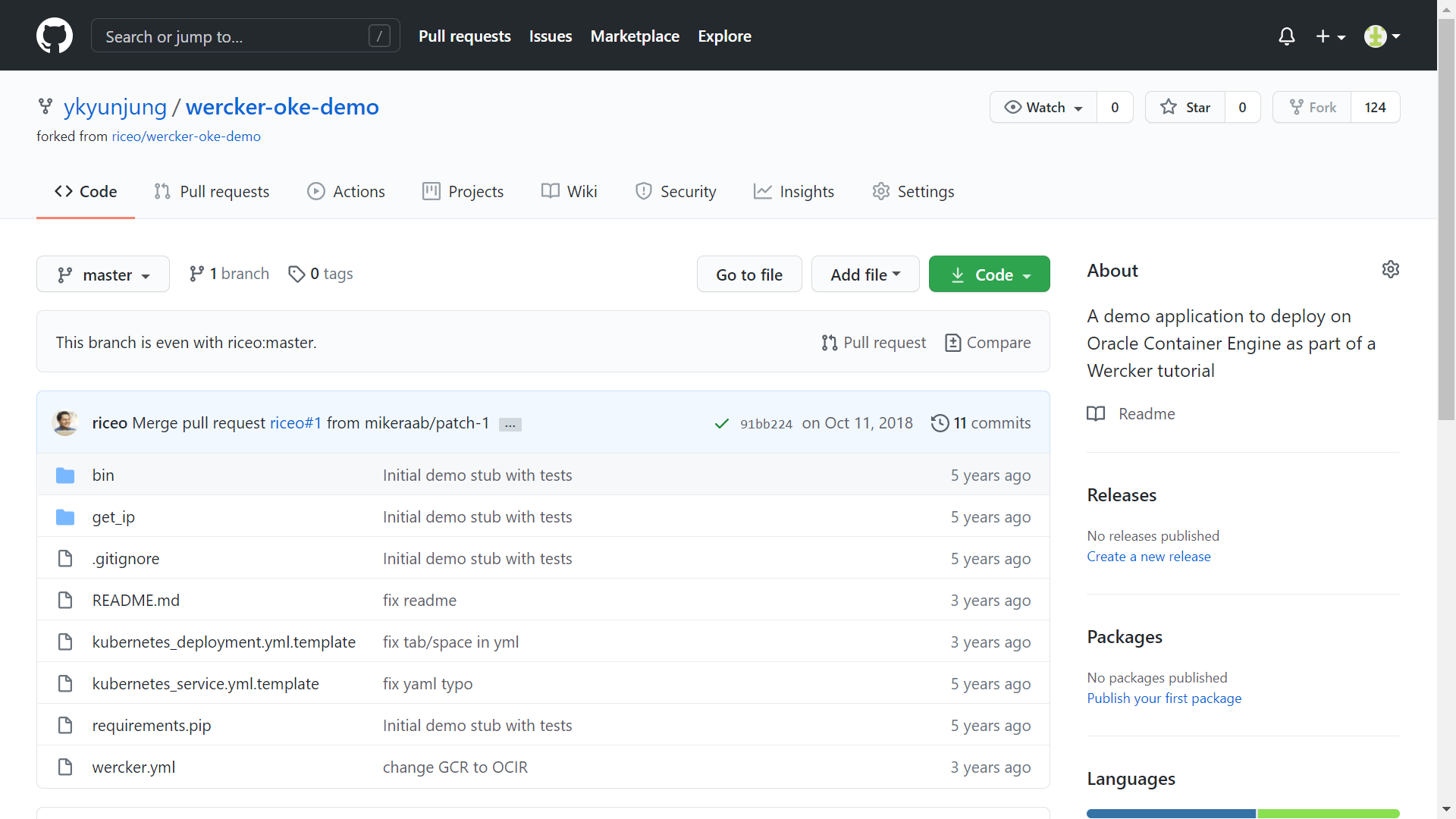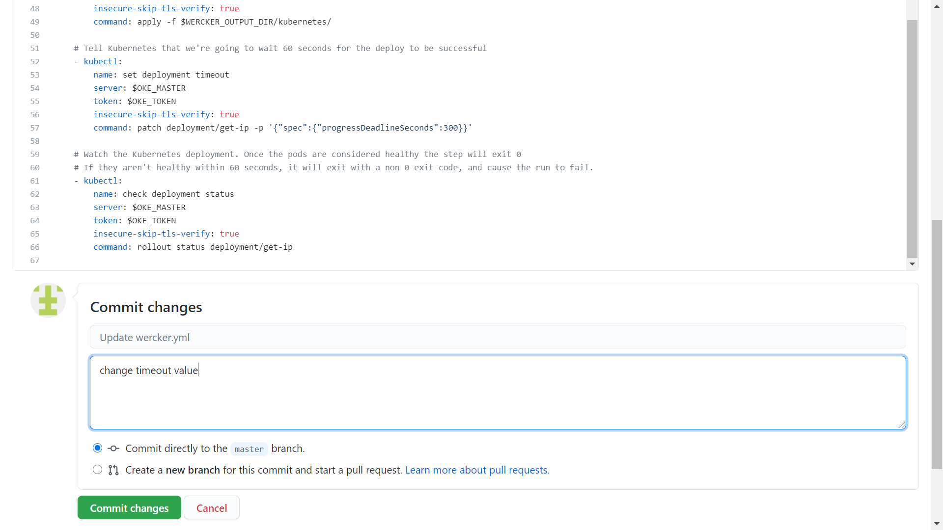 이제 OCI 레지스트리에서 가져온 이미지를 OCI 클러스터에 배포할 차례이다. Wercker의 파이프라인은 GitHub의 어플리케이션 소스 파일이 변경이 되면 자동으로 수행이 된다. 여기에서는 GitHub 소스를 변경했을 때 자동으로 배포가 되는 것을 테스트해 볼 것이다.