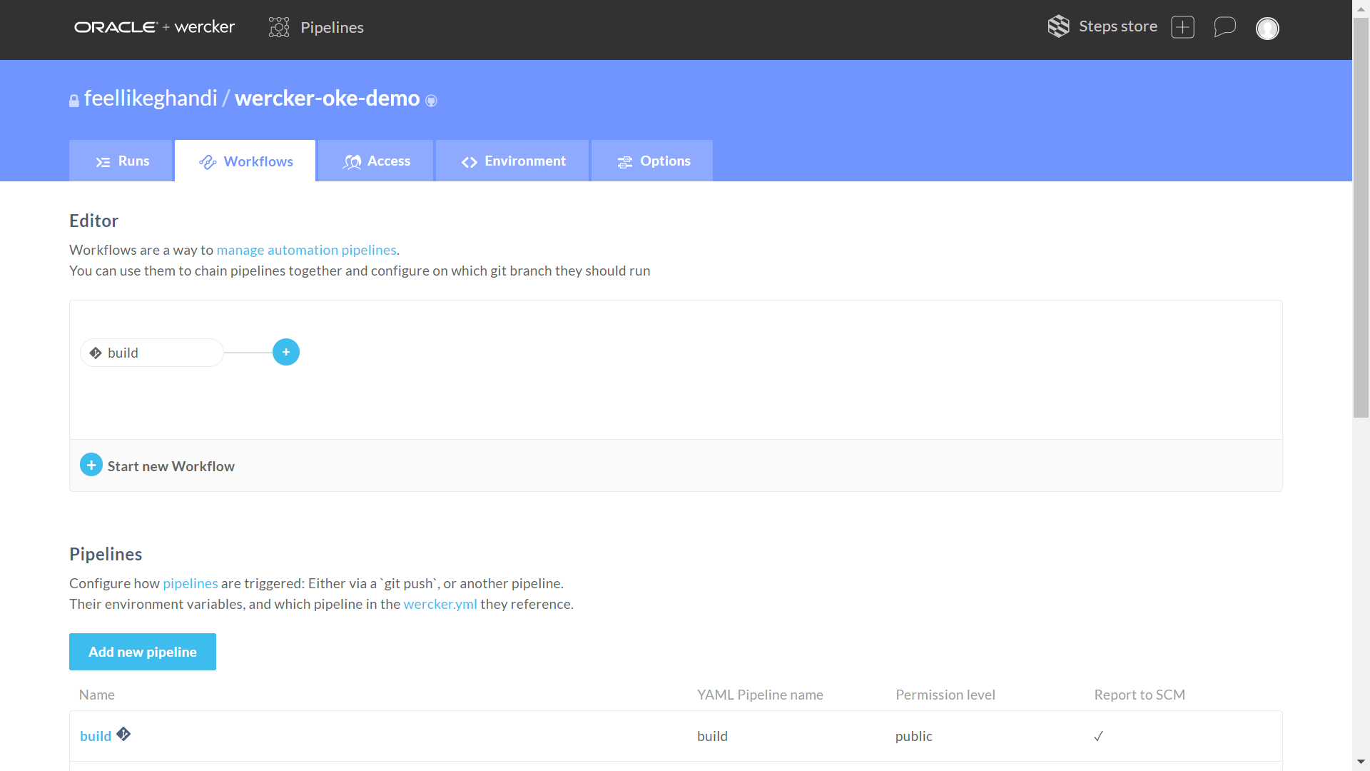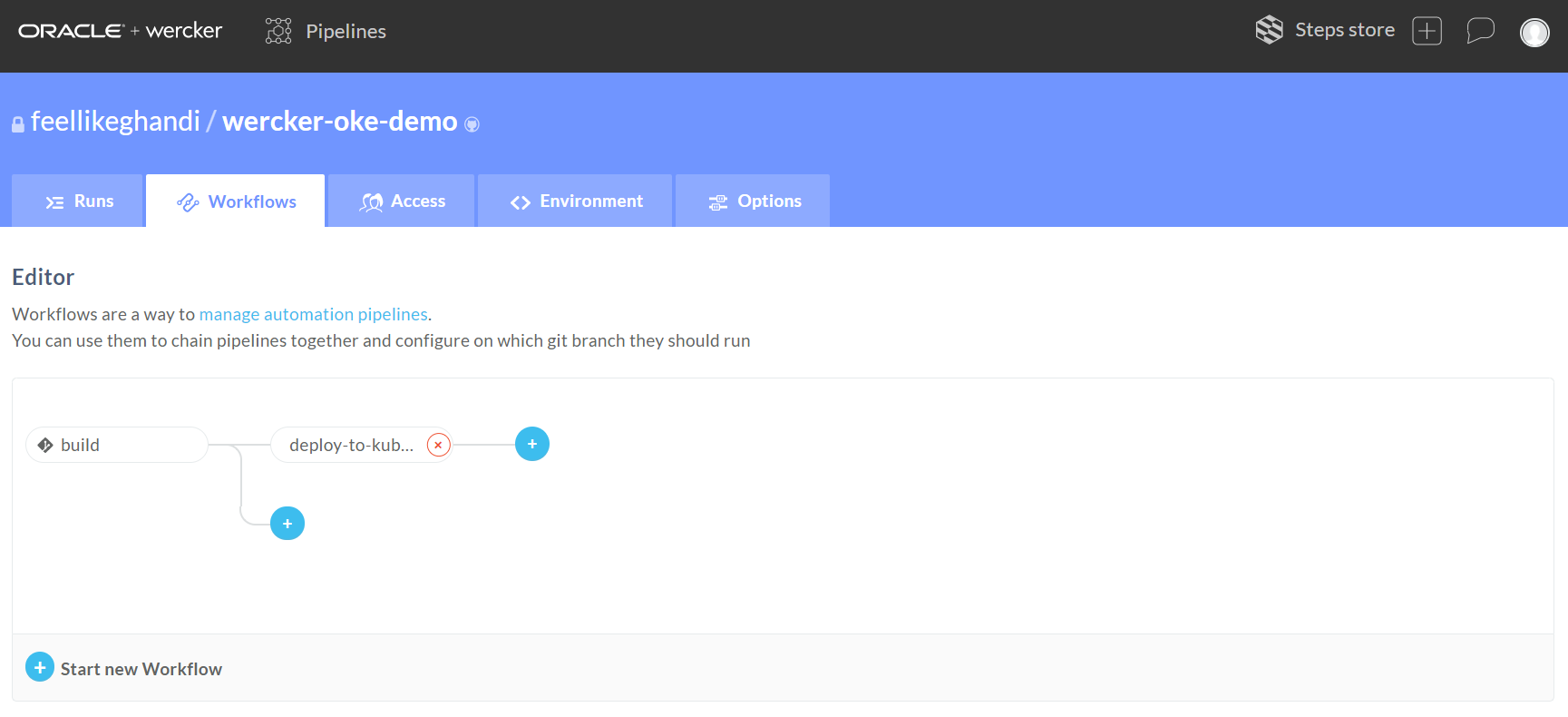 이번 순서는 OCI 쿠버네티스 클러스터에 컨테이너를 배포하기 위해 Wercker 어플리케이션에 “deploy-to-kubernetes”라는 이름으로 워크플로우를 생성할 것이다. “deploy-to-kubernetes”는 지금까지 살펴본 wercker.yml 파일에서 정의된 배포에 대한 정의로서 Wercker 워크플로우의 파이프라인에서 이 이름을 사용할 것이다.