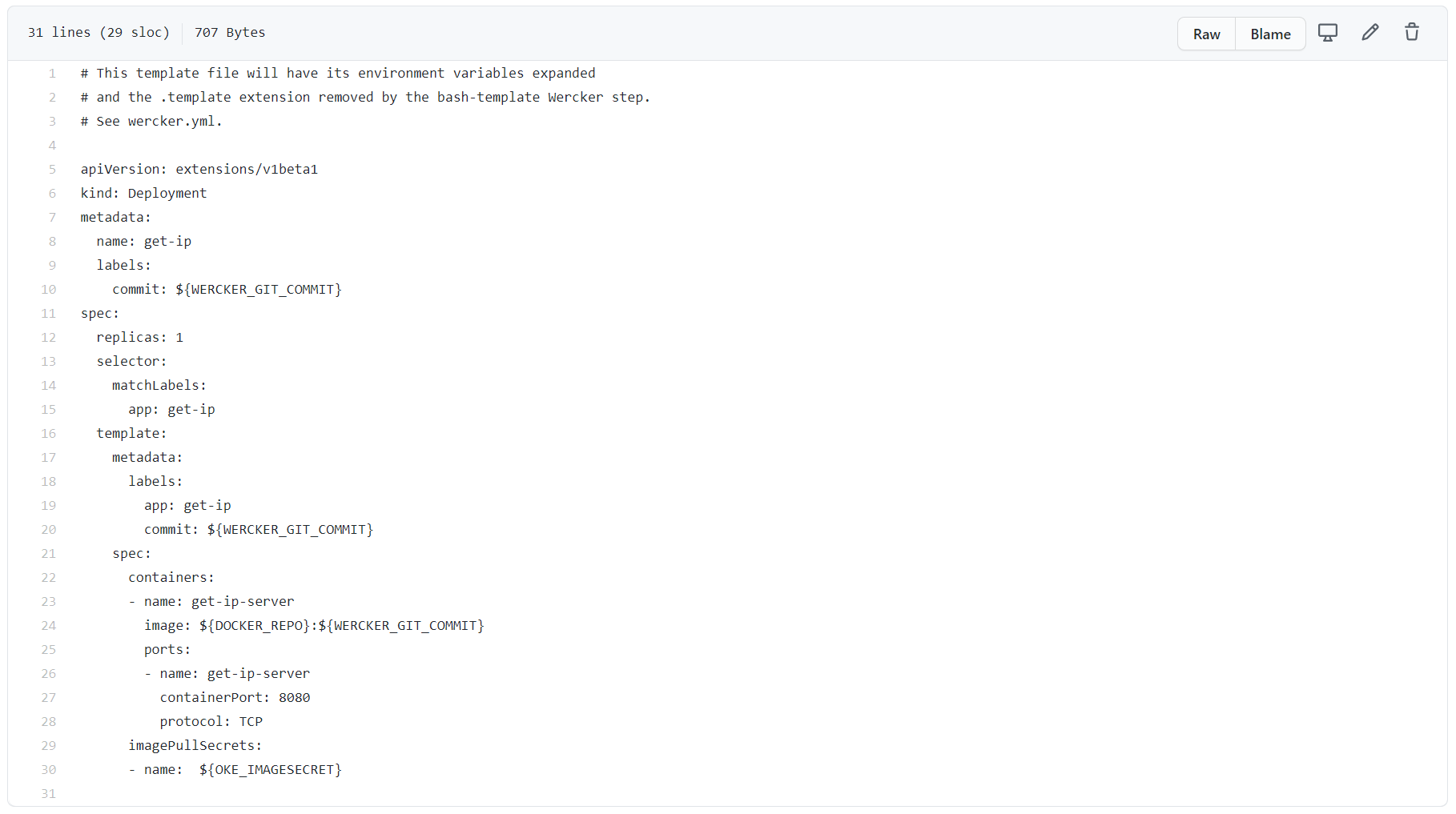 OCI 레지스트리에서 이미지를 가져와서 클러스터에 배포를 할 때는 쿠버네티스 매니페스트 파일에 설정된 내용으로 배포를 하게된다. 지금 테스트하고 있는 GitHub 소스에는 “kubernetes_deployment.yml.template”라는 이름의 매니페스트 파일이 있다. 여기에 시크릿 이름, OCI 리포지토리 등의 변수가 있고, 이후 설정된 값이 Wercker로 전달될 것이다.