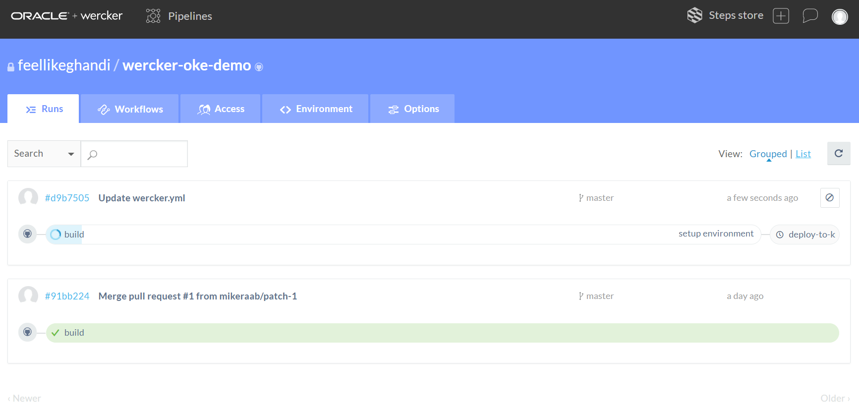 이제 OCI 레지스트리에서 도커 이미지를 가져와서 OCI 쿠버네티스 클러스터에 Wercker 파이프라인으로 배포할 차례이다.
