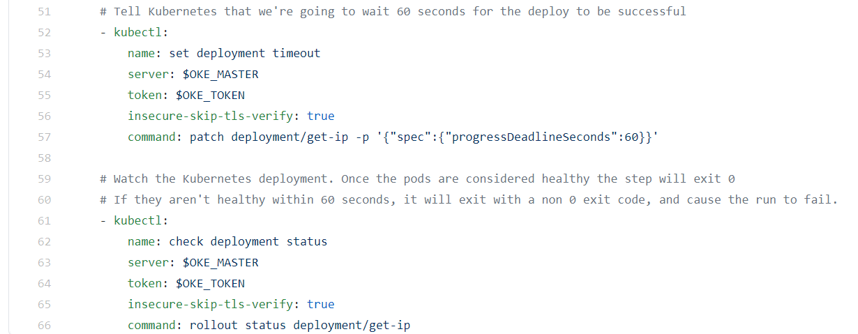 그리고 배포에 60초 타임아웃을 설정하여 컨테이너가 성공적으로 시작할 때 까지 60초를 기다린다. 모든 파드가 기동될 때까지 배포 상태를 확인한다. 만일 파드가 배포되지 않고 타임아웃에 도달하면 종료 코드가 리턴되며, 파이프라인은 실패한다. 어플리케이션이 성공적으로 배포된 경우에만 파이프라인이 성공하고, 그렇지 않은 경우는 실패 처리를 한다.