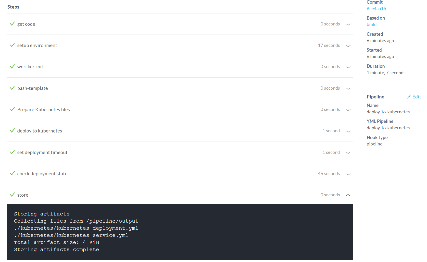 참고로 wercker.yml 파일 내용에서 deploy-to-kubernetes 부분을 살펴보면, 먼저 디렉토리를 만들어서 쿠버네티스 설정 파일들을 옮긴다. 이 설정 파일들로 kubectl 명령을 실행하여 배포를 수행할 것이다.