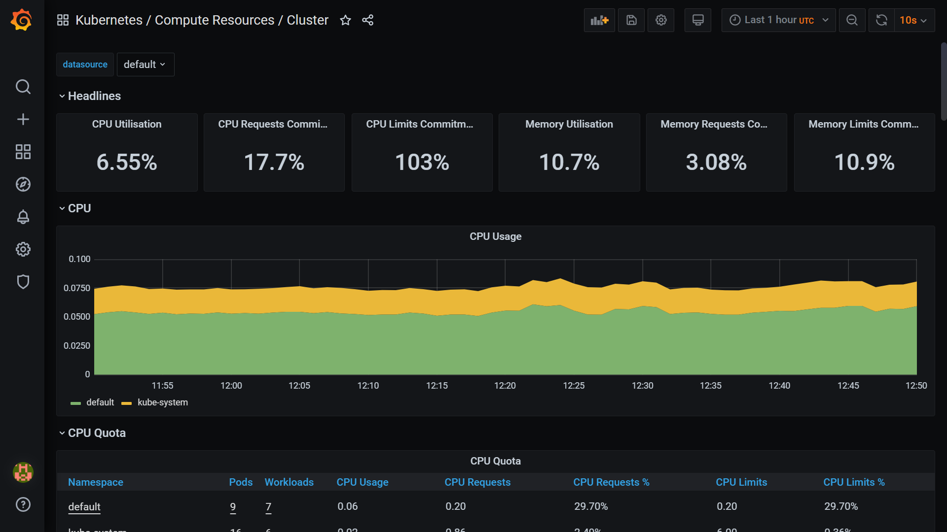 오른쪽 대쉬보드 메뉴 아래 Manage 화면으로 이동하면 prometheus가 수집한 다양한 쿠버네티스 메트릭에 대한 대쉬보드들을 확인할 수 있다. 아래는 클러스터 노드의 자원 사용 현황 화면이다.